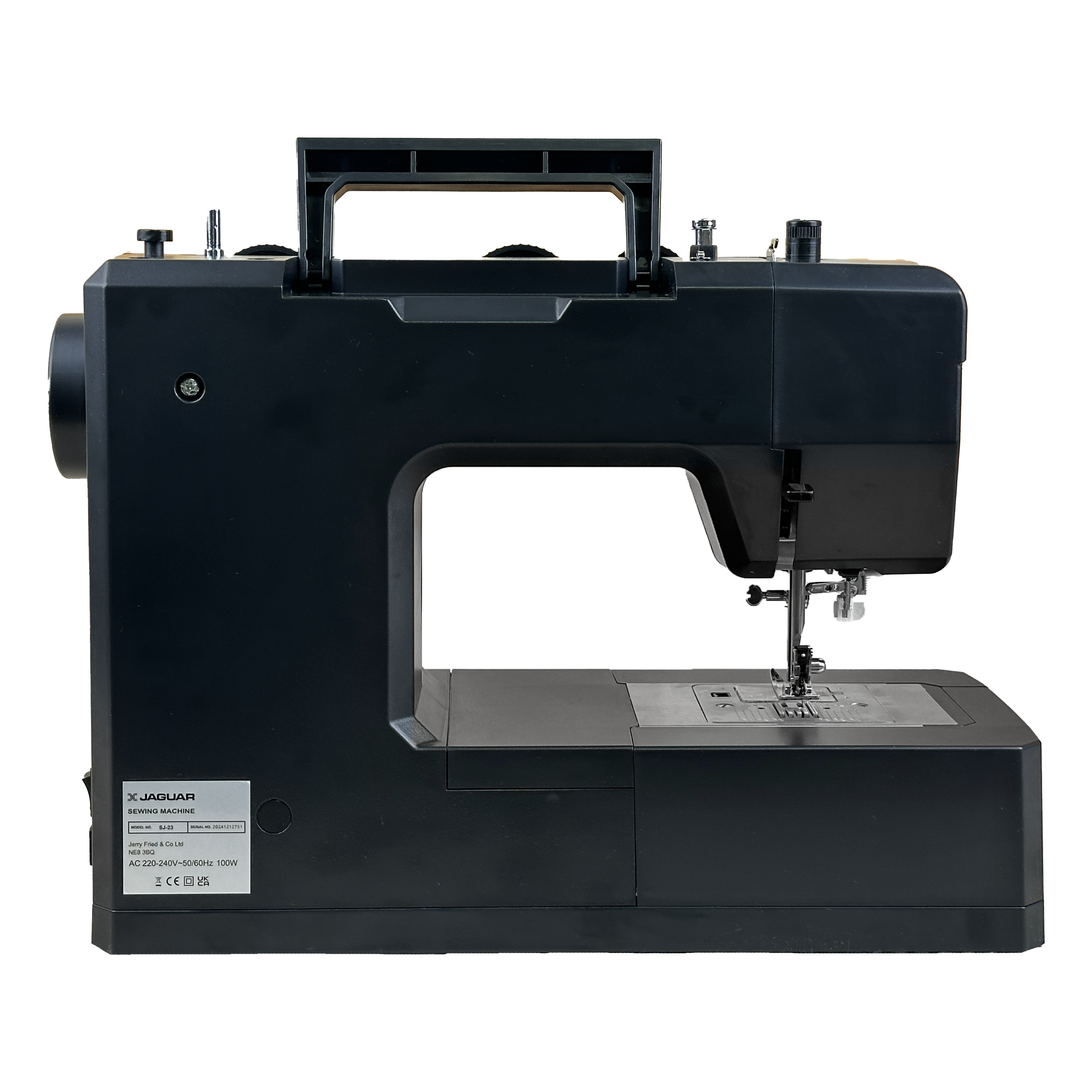 The electronic foot controller allows for precise speed control, ensuring an effortless sewing experience at your own pace. The built-in LED light illuminates the sewing area for optimal visibility, which is especially useful when working with dark fabrics or in low-light conditions. Despite its robust performance, the Jaguar SJ-34E remains compact and portable, featuring a lightweight design and a convenient carrying handle for easy transport and storage.